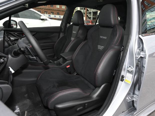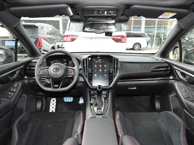 坐进车内,11.6英寸中控触摸屏与12.3英寸全液晶仪表盘组成科技双屏,信息显示清晰直观。平底方向盘带有红色缝线与STI标识,握感十足。中控区域采用翻毛皮材质包裹,触感细腻高级,搭配Recaro运动座椅,战斗氛围瞬间拉满。