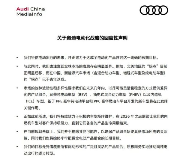 奥迪在声明中强调,其始终坚信电动出行是行业未来的发展方向,并致力于达成全电动化产品阵容的长期目标。不过,全球市场的发展态势存在明显差异,例如北美地区新能源汽车发展的“拐点”有所后移,而中国市场早在去年就已迎来新能源汽车市场(涵盖混合动力、增程式及纯电动等车型)的“拐点”。