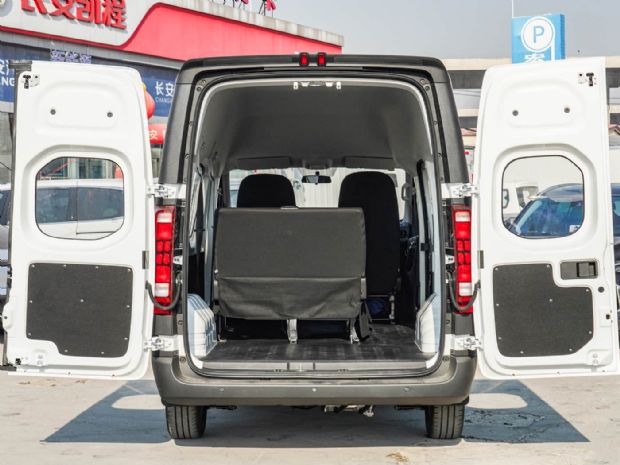 尺寸方面,长安凯程V919车长5.5米,货厢超3.3米,高1.75米,得舱率高达61.51%,拥有10.3立方米超大空间。1.74米宽货箱、1.05米中门开度与270°尾门开度,方便叉车托盘进出;低地台设计,中门最低547mm、尾门最低586mm。高承载底盘与高强度车身,使其载重超1.7吨,五横九纵车架结构,高强钢占比达68.5%,还支持3.3KW车厢供电与6.6KW车外放电。