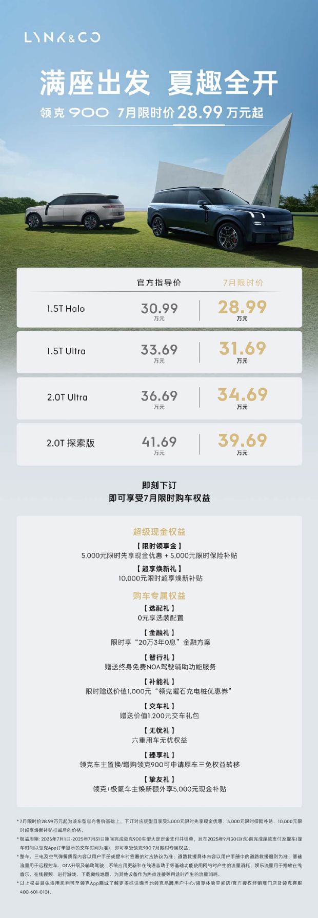 7月1日最新消息,领克900迎来超值福利!官方指导价30.99-41.69万元的它,本月限时售价低至28.99万元起,最高降价达2万元,限时售价区间为28.99-39.69万元。不仅价格诱人,购车福利更是诚意满满,除了价格优惠,还能享受5000元限时先享金、5000元限时保险补贴,以及高达10000元的限时超享焕新补贴,实打实的优惠,让人心动不已。