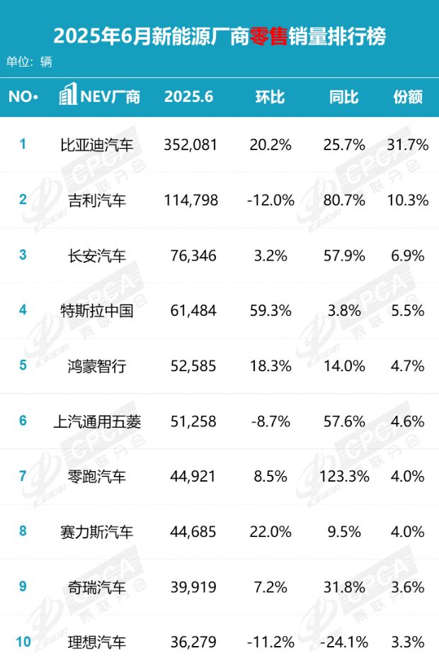 从车企新能源零售销量来看,6月份比亚迪以35.2万辆的销量断层领先,吉利汽车排名第二位,新能源销量11.5万辆。长安汽车、特斯拉中国位列第三和第四位,鸿蒙智行、上汽通用五菱排名第五和第六位,新能源销量均超过5万辆。零跑汽车、赛力斯、奇瑞汽车、理想汽车分列第七至第十位。