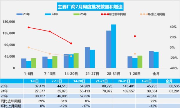 7月1-20日,全国乘用车厂商批发96.0万辆,同比去年7月同期增长22%,较上月同期下降12%;今年以来累计批发1,424万辆,同比增长13%。