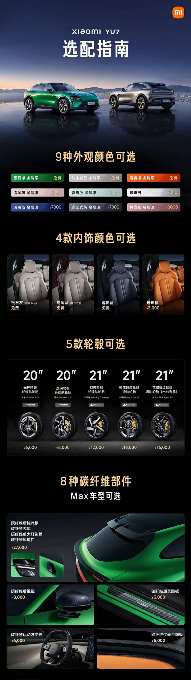 作为已上市车型,小米YU7推出3款配置,售价25.35万-32.99万元,定金5000元。外观上,其标志性“水滴大灯”极具辨识度,上半部分镂空设计与机舱盖开口连通,有效降低风阻;车尾光环尾灯经扁平化处理,搭配双层扰流板与运动化下包围,运动气息扑面而来。