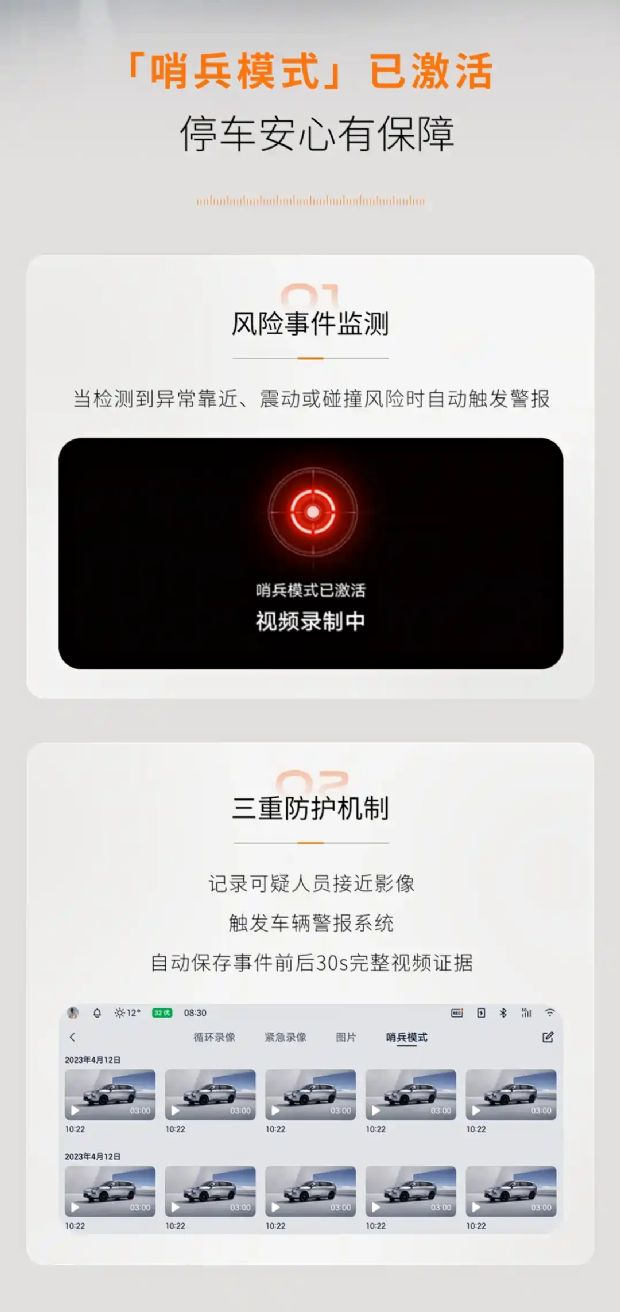 哨兵模式堪称车辆的 “智能守护者”,当监测到异常靠近、振动或碰撞风险时,会自动触发警报,同时通过车载摄像头留存事件前后 30 秒的完整视频,为车主留存关键证据,提升停车安全系数。