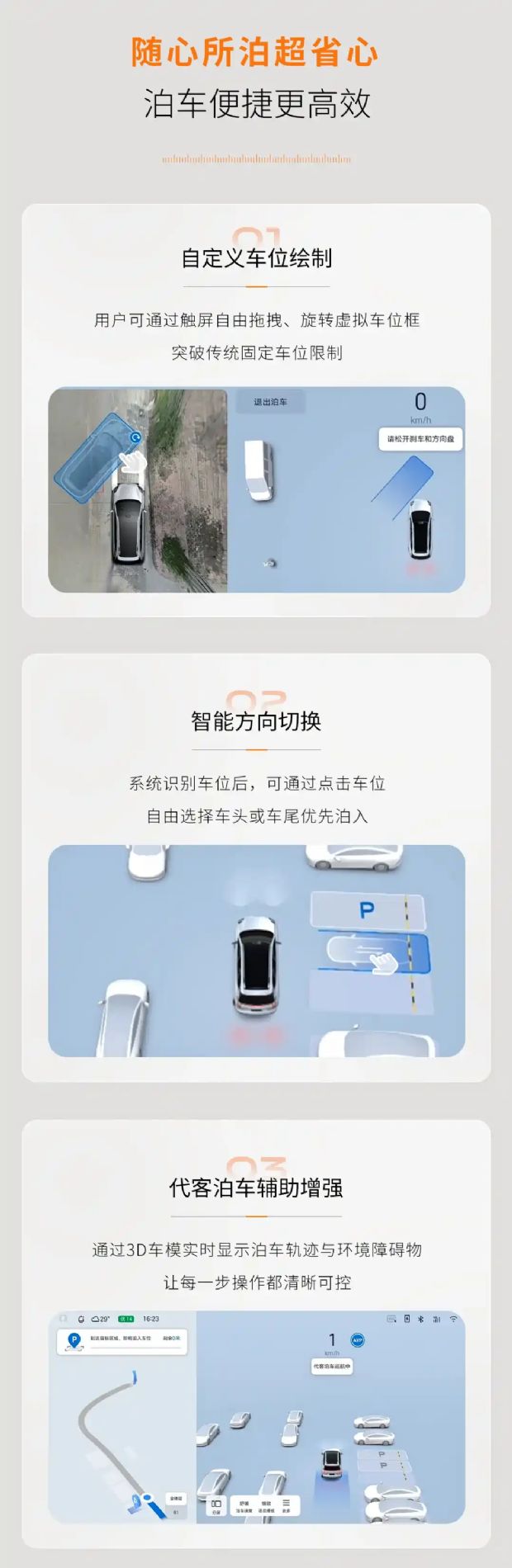 智能泊车辅助此次升级带来不少惊喜,支持用户自定义车位,不再受限于传统划线车位。识别车位后,还能灵活设置车头方向,泊车过程中系统通过 3D 建模实时展示轨迹与周边环境,让驾驶员掌控更清晰。