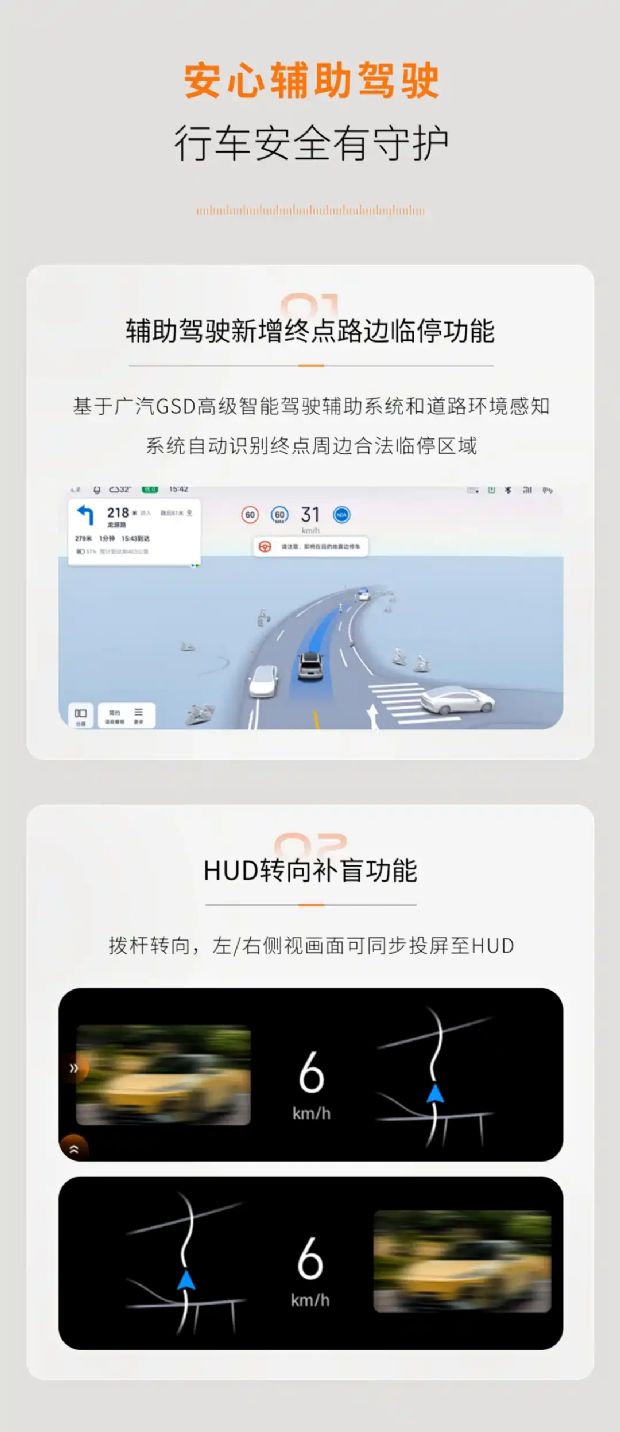 智驾辅助新增终点路边停靠功能,依托智驾系统可自动识别合法临时停车区域;HUD 显示也加入盲区监测,打转向灯时,对应侧盲区画面会同步投射到 HUD 上,提升变道安全性。