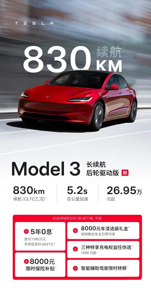 值得关注的是,特斯拉同步升级了高性能全轮驱动版的续航表现,其CLTC工况续航里程从623公里提升至647公里。为提升购车吸引力,官方针对Model 3系列推出多重购车礼遇:包括5年0息金融方案、8000元限时保险补贴、8000元车漆选装礼金,以及特享充电权益和智能辅助驾驶限时免费转移政策。