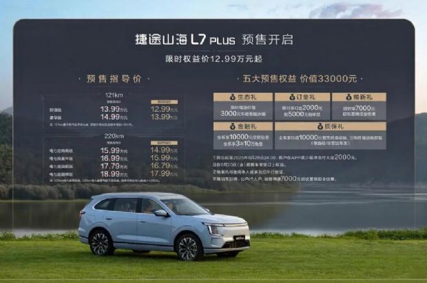 8月19日,捷途官方消息显示,捷途山海L7 PLUS将于8月26日正式上市。新车已开启预售,共推出6款车型,预售价区间13.99-18.99万元,限时权益价低至12.99-17.99万元。作为定位中型SUV的新车,其尺寸比捷途山海L7更大,提供5座和7座两种座椅布局选择,满足不同家庭用车需求。