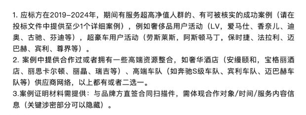 此次招标对投标主体有明确要求,需拥有独立设计团队,且团队负责人需具备服务过苹果、可口可乐、LVMH、保时捷、劳斯莱斯、阿斯顿・马丁、奔驰等同级别品牌的经验。同时,应标方在2019-2024年间需有服务超高净值人群的可核实成功案例,如奢侈品(LV、爱马仕、香奈儿等)或超豪车(劳斯莱斯、法拉利、宾利等)用户活动,并在投标文件中提供至少1个详细案例,且要求合同签订后一周内到岗。