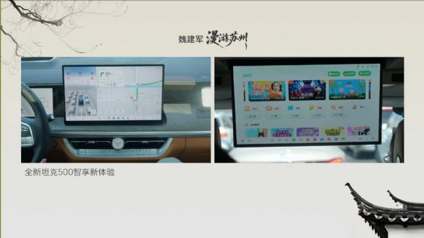 针对全家人的座舱娱乐需求,全新坦克500实现车内6屏交互,包括行业最薄15.6英寸2.5K超高清中控大屏、17.3英寸3K吸顶超大娱乐屏、12.3英寸全彩数字虚拟组合仪表、HUD抬头显示、流媒体内后视镜、后排扶手屏,支持三指滑屏传屏与应用共享,满足全家信息交互需求。系统还预装了深度定制的QQ音乐、网易云音乐、爱奇艺、喜马拉雅APP,搭配Coffee AI Sound咖啡智能音响系统,让全家人的旅途娱乐不停歇。