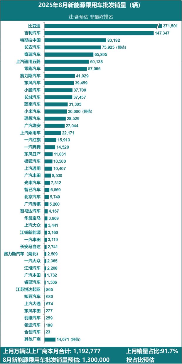 乘联会最新数据显示,2025年8月新能源乘用车批发销量预估达130万辆,上月销量过万的厂商,本月合计卖出1192777辆,占比超九成,新能源汽车市场的火热程度可见一斑。在这场市场角逐里,不同阵营的车企表现差异明显,自主车企集体爆发,外资、合资品牌压力重重,新势力与跨界选手也各有境遇。