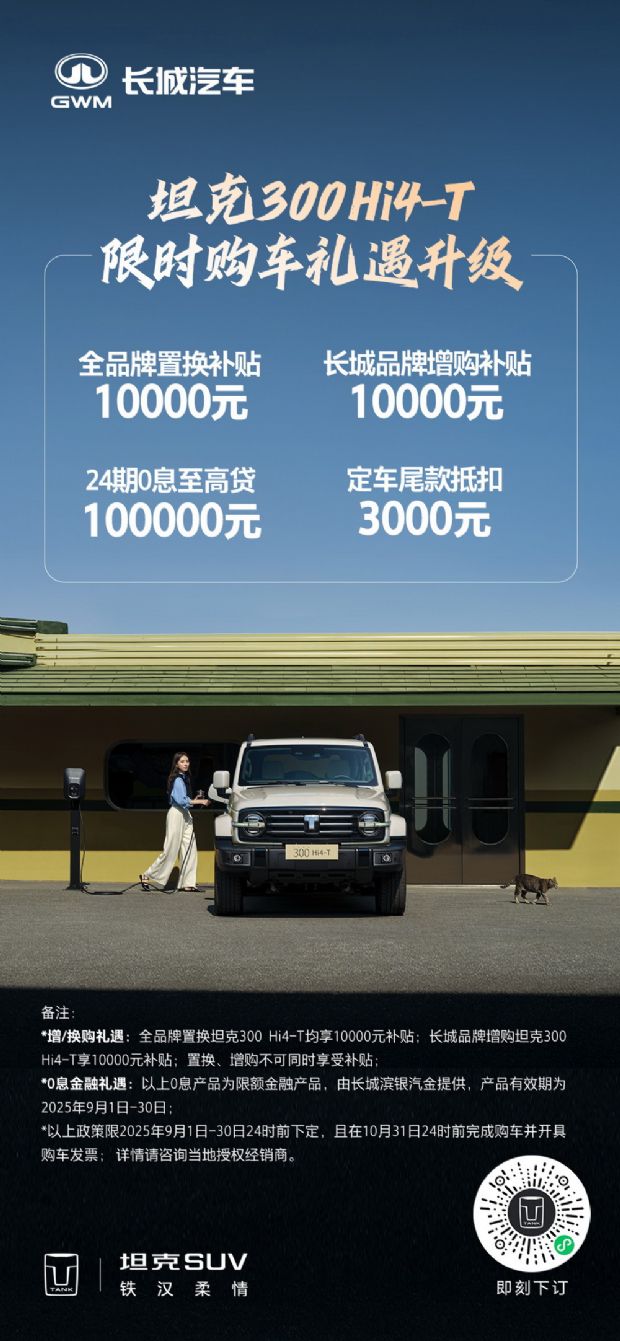 坦克300 Hi4-T凭借其经典方盒子造型、强悍越野性能与豪华智能配置的完美融合,不仅赢得了众多越野爱好者的青睐,更成为都市潮流人群彰显个性的时尚座驾。为满足广大用户需求,九月订购坦克300 Hi4-T,可享以下超值权益: