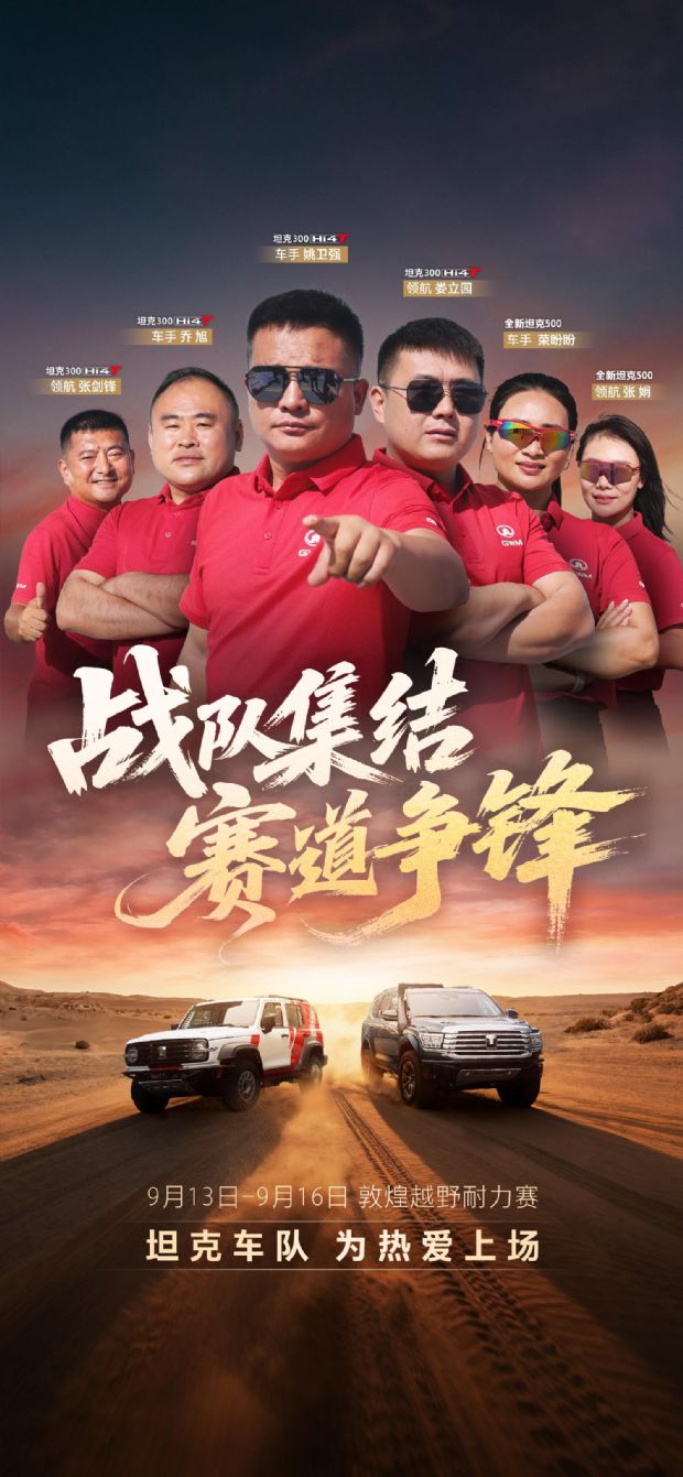 环塔硝烟方散,敦煌征途再启。“为热爱上场”的坦克将以强悍的实力迎接沙漠戈壁的挑战,以可靠品质守护每一份对越野的热爱和梦想。未来,坦克将继续秉持这份铁汉柔情的精神陪伴每一位勇敢的逐梦者,为越野爱好者打造更多值得信赖的越野座驾,与更多人一同奔赴山海、无畏前行。现在,让我们一起期待9月13日至16日,看冠军车手与坦克战车共舞千里荒漠,再一次,为中国越野写下热血与梦想交织的篇章!