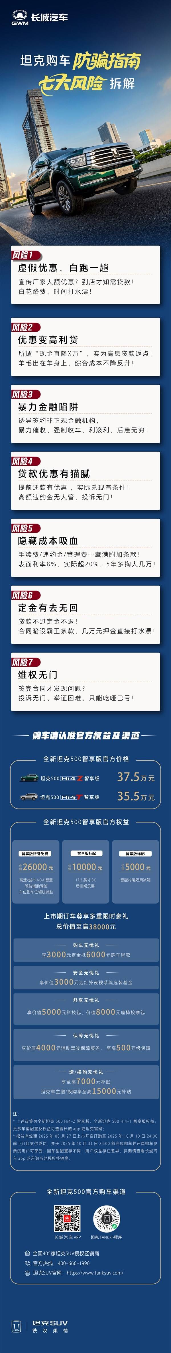 对此,坦克品牌明确,新车销售及服务仅通过官方授权经销商(4S店)、长城汽车APP、坦克TANKAPP、坦克TANK小程序、官方认证账号及商城开展。