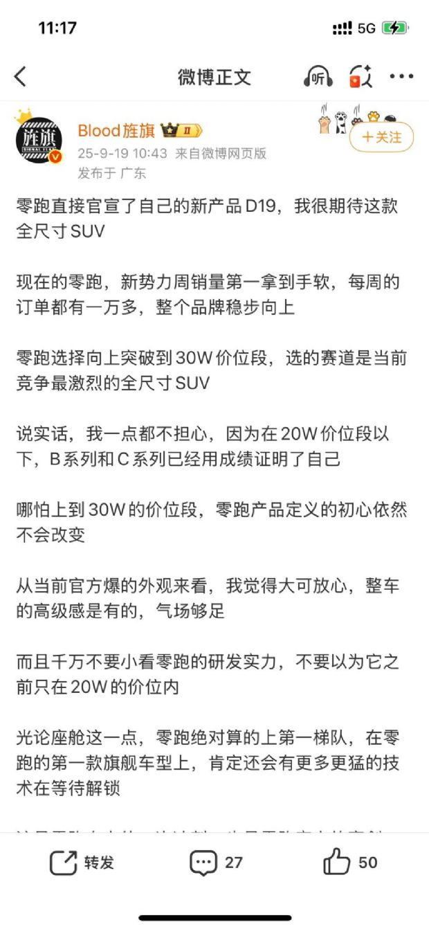 在之前的采访里,零跑老总朱江明说了要在25-30万元的区间里做到顶配中的顶配,相信零跑会迎来D系列的开门红。零跑400万年销拼图,豪车是非常重要的一块,在豪华车这场最难但又必须要赢的关键之战,零跑一定可以打赢!#零跑汽车##零跑D19##造车新势力#