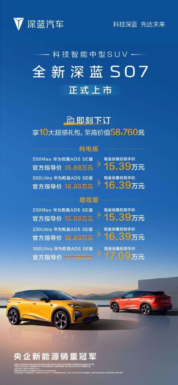 近日,全新深蓝S07以15.69万-17.39万元价格正式上市,并提供了至高58760元的预售权益礼包。同时,新车还依靠着南京数智工厂完成了包括全系标配华为乾崑ADS SE、深蓝超级增程2.0以及可变自适应底盘等在内的四重升级,可谓是诚意满满。