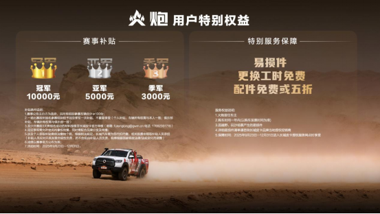 为满足广大用户的需求和呼声,凡驾驶V6火炮参加规模超过100台赛车的政府举办的赛事,将给予冠亚季军3000-10000元赛事补贴;同时,为降低车友玩车成本,针对火炮首任车主,一年内因越野、玩沙场景损坏更换的易损件,更换工时免费,部分配件按市场指导价免费或五折提供。此外,长城还坚持开展赛事共创机制,携手俱乐部车队、车手、改装厂等,为车手提供技术培训、配件支持、应急维修、营地保障等专业完备的支持,助力普通玩家实现从“自己玩”到“能参赛”的跨越。
