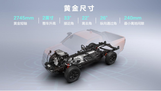 新车升级博格华纳高性能四驱系统,承载扭矩3300N·m,4L速比由2.48提升为2.64,脱困能力更强;标配前/后桥电控式差速锁、蠕行模式、坦克转弯、6种全地形驾驶模式等硬核装备,让越野更从容;还提供越野专家模式,可一键关闭电子辅助设备,满足越野老炮的驾驶乐趣。此外,车架采用99%高强钢,结合大截面纵梁,实现超强扭转刚度,为用户的安全架起一道坚固防线!大幅提升底盘强度(传动轴/驱动轴/车架/悬架等 ) ,面对飞车等极限越野场景也更从容。