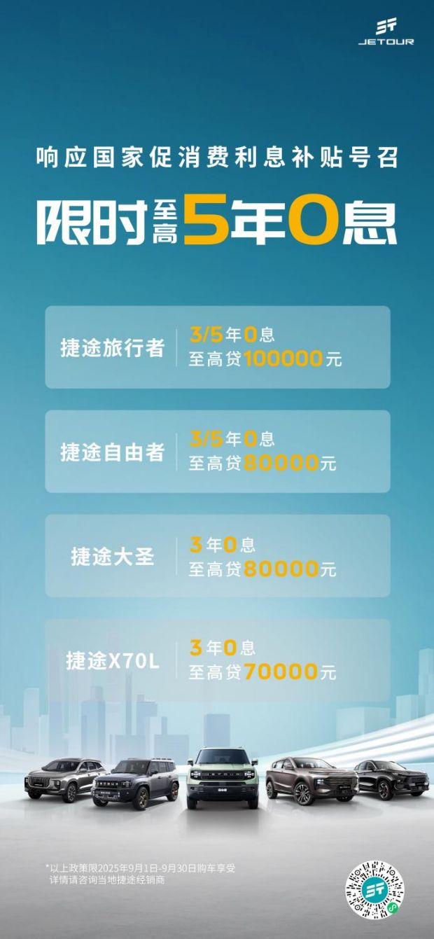 为了让更多人能即刻开启“向往的旅行”,捷途汽车9月推出限时钜惠,方盒子冠军家族更是诚意拉满,捷途旅行者可享至高5年0息贷款+6次免费保养,至高可贷100000元。捷途自由者置换补贴高达15000元,至高可贷80000元。