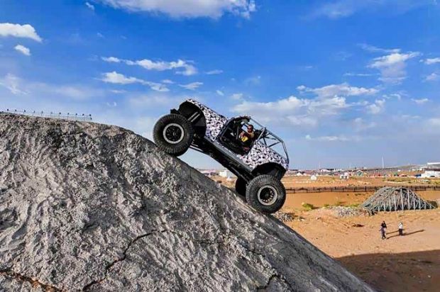 如果说沙漠冲沙是速度与激情的释放,那么岩壁攀爬则是力量与控制的艺术。10月1日,在阿拉善梦想公园攀岩赛道,著名越野攀爬玩家、虎克之路创始人高劲松,驾驶着一辆爆改版坦克为全场观众奉献了一场心跳加速的极限攀爬表演。
