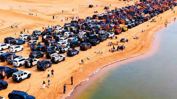 上午10:01,随着指挥车一声令下,这支钢铁长城开始缓缓移动,向着沙漠中的绿洲月亮湖昂扬进发。从空中俯瞰,车队犹如一条蜿蜒的巨龙,在金色的沙海中划出坚定的轨迹。数量值得载入史册的单一品牌车队集结,不仅彰显了“坦克团”越野用户群体的强大凝聚力,更以这种独特的方式,向伟大的祖国母亲献上来自中国越野人最崇高的敬意。