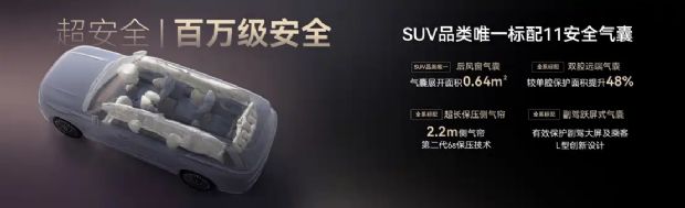 安全上,全系标配磐石车身2.0(88%高强度钢铝合金,37300N・m/deg扭转刚度),强度高且减噪。被动安全有11个气囊,2200mm侧气帘(二代6s保压,0.02s响应)护二排,主驾膝部气囊降下肢风险,副驾跃屏式气囊护乘客与大屏,后风窗气囊补三排盲区。主动安全全系标配AEB紧急制动。