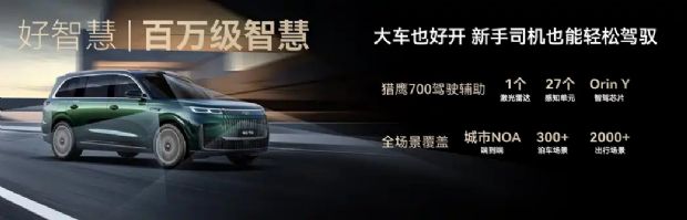 辅助驾驶层面,该车配备27个感知单元(3毫米波雷达+12超声波雷达+11摄像头+激光雷达),搭载OrinY芯片(200tops算力),支撑28项功能(无保护左转、信号灯识别等)。标配猎鹰500系统,高配为猎鹰700,应对复杂路况更从容。