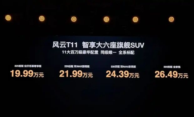 10月13日,奇瑞风云T11正式启动预售,共推出4款车型,预售价19.99-26.49万元。作为大型SUV,其采用2+2+2六座布局,适配多成员家庭出行。动力上搭载1.5T增程系统,CLTC纯电续航220km,综合续航超1400km,化解长途续航焦虑。该车还配备激光雷达,支持28项功能及城市NOA辅助驾驶,科技属性突出。据官方数据,风云品牌累计订单已达23188台,市场热度颇高。