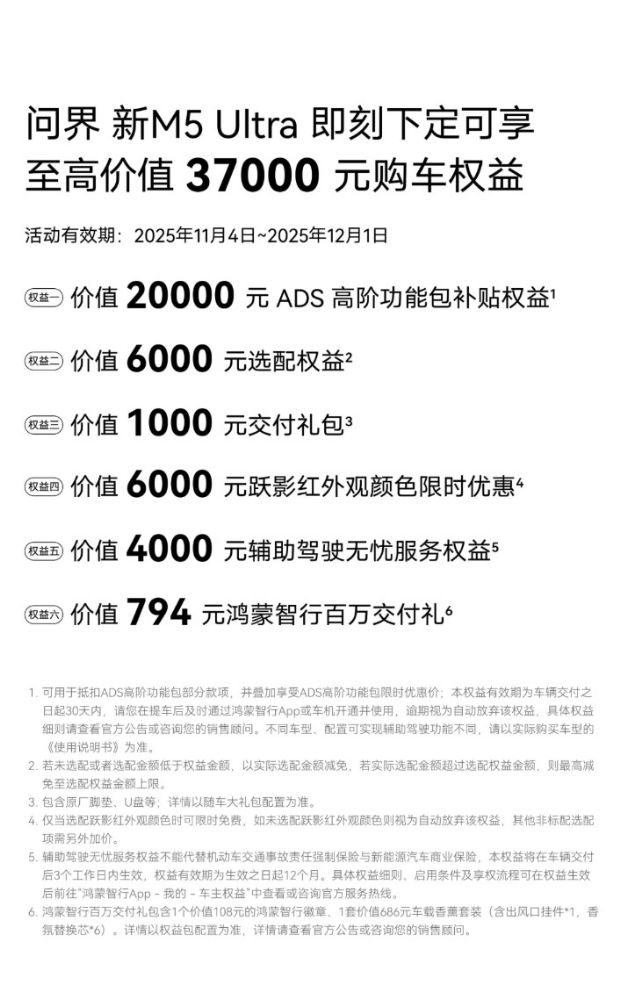 问界新M5 Ultra以其全场景实力,无惧冬日复杂环境的挑战,为用户带来可靠的安全守护与舒适的出行体验。当前,问界新M5 Ultra推出至高价值37794元的购车权益,包括20000元ADS高阶功能包补贴、6000元选配权益、1000元交付礼包、4000元辅助驾驶无忧服务权益、794元鸿蒙智行百万交付礼。针对跃影红新车色,还推出6000元限时优惠。钜惠福利不容错过!如果您近期有购车计划,不妨前往线下门店亲自试驾体验,下定吧。