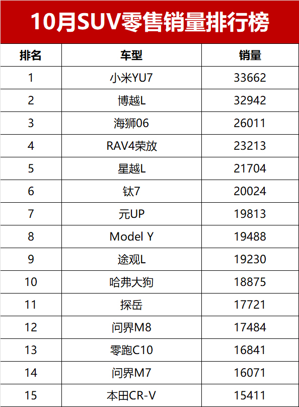 具体来看,10月零售销量破万辆的SUV共33款,其中自主品牌车型占比超七成,新能源与燃油车呈现均衡竞争格局。小米YU7成为最大黑马,以33662辆的销量首次登顶SUV销量冠军;博越L紧随其后,以32942辆的销量位居亚军,两款新车共同改写了SUV榜单头部格局。海狮06以26011辆的销量排名第三,助力自主品牌包揽前三甲。