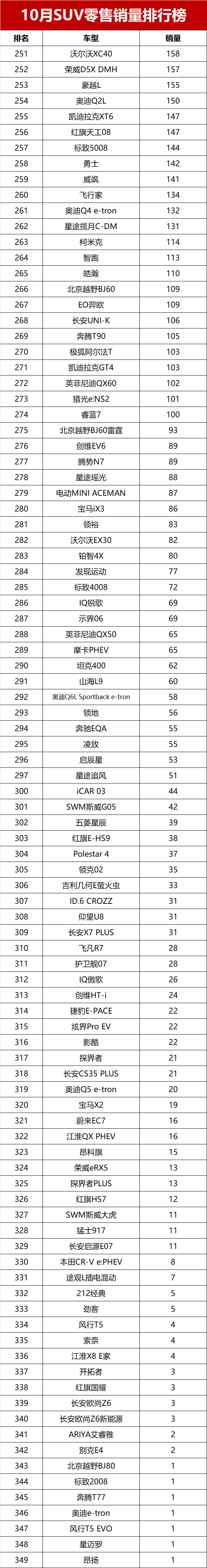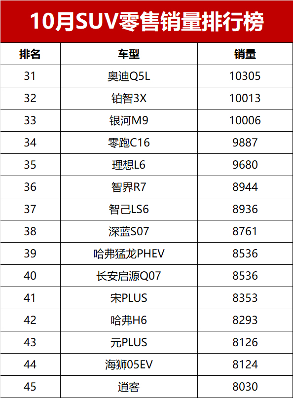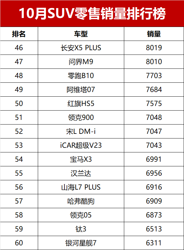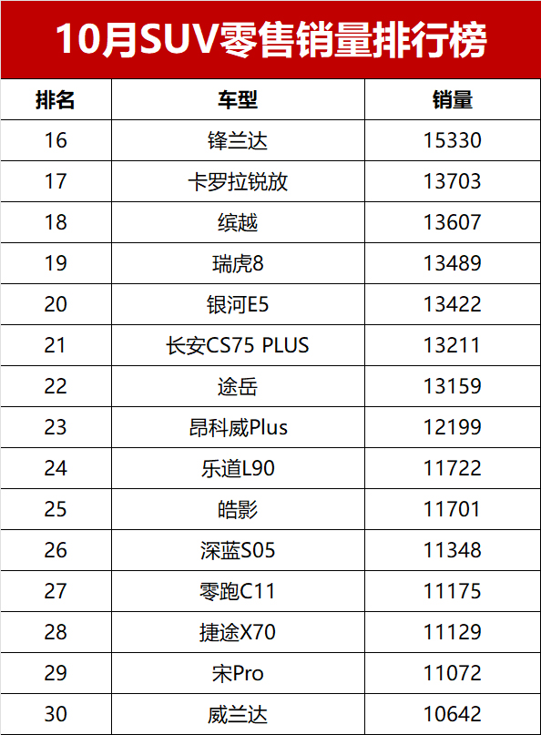 【2025年10月SUV零售销量排行榜 完整版】“金九银十”车市旺季持续发力,SUV市场成为最大亮点。乘联会数据显示,2025年10月国内SUV市场零售销量达114.3万辆,同比小幅增长0.5%,环比9月微增1.2%,延续稳健增长态势。榜单格局迎来大洗牌,冠军亚军双双易主,33款车型销量破万;燃油SUV展现超强韧性,前十榜单中占据五席;新能源SUV表现分化,特斯拉Model Y跌出前六,自主品牌多款新车强势突围。黑马逆袭!10月SUV销量榜,国产车霸榜前三,燃油车坚守半壁江山!