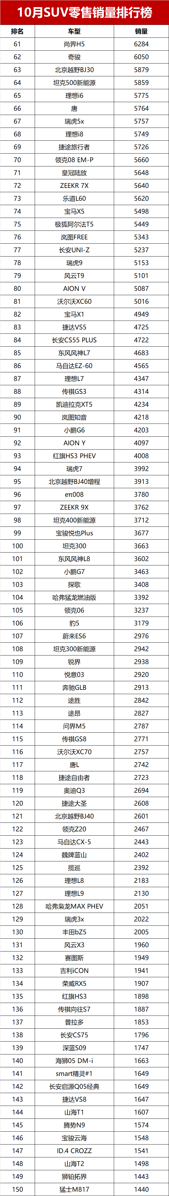曾经的销量霸主表现不及预期,哈弗H6以8293辆的销量排名第42位,宋PLUS和元PLUS分别以8353辆和8126辆的销量位列第41和43位。比亚迪宋Pro和唐分别以11072辆和5764辆的销量排名第29和66位,其中唐的销量同比下滑明显。理想汽车多款车型销量遇冷,L6、L7、L8、L9分别位列第35、87、126、127位,最高销量仅9680辆。
