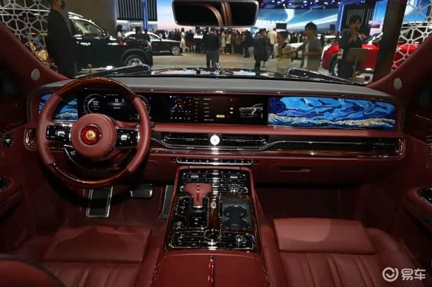 车展上展出的为国礼“丹霞”主题定制版车型,其设计灵感源自广东韶关仁化丹霞山的丹霞地貌,该地区极具特征性的红色砂砾岩地貌构成了绚丽的红色山体,犹如自天际飘落的霞光。此外,该车的座舱内四门门饰板上还加入了漆画点缀,氛围感直接拉满。