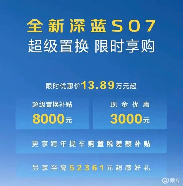 11月24日,深蓝汽车宣布新款深蓝S07超级置换补贴正式上线,包含现金优惠3000元、超级置换补贴8000元,更可享跨年提车购置税差额补贴,限时优惠价13.89万元起。另外还可享至高52361元超感好礼。