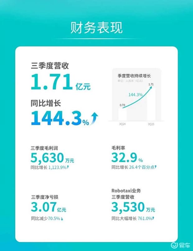11月24日,文远知行WeRide发布2025年第三季度财报。三季度,公司营收1.71亿元,同比增长144.3%,是公司成立以来涨幅最大的季度之一;Robotaxi业务营收3,530万元,同比增长761.0%,延续强劲增长势头;毛利润5,630万元,同比增长1,123.9%;毛利率32.9%,同比增长26.4个百分点,持续领跑行业;净亏损3.07亿元,同比减少70.5%;经调整后亏损2.76亿元。