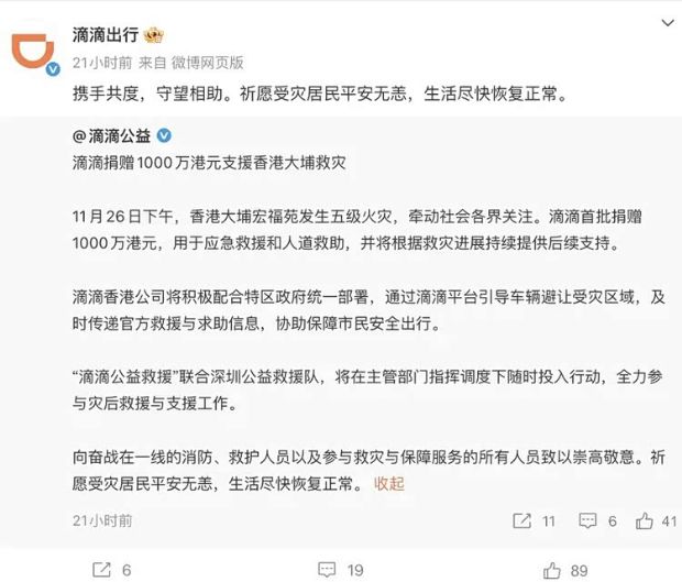 日前,滴滴官方宣布,香港大埔宏福苑发生五级火灾,牵动社会各界关注。滴滴首批捐赠1000万港元,用于应急救援和人道救助,并将根据救灾进展持续提供后续支持。