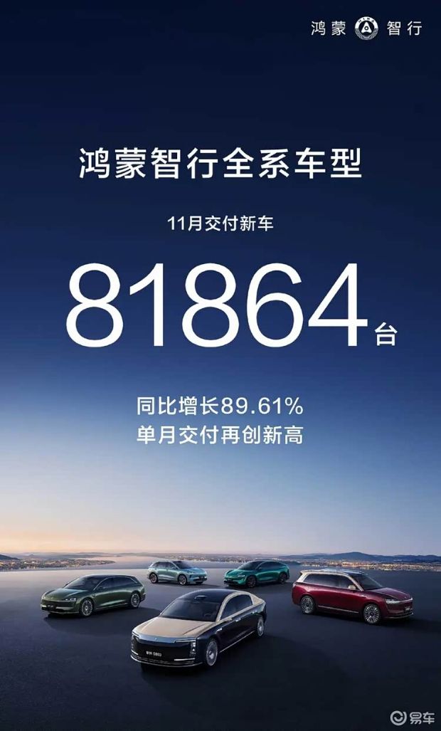 12月1日,鸿蒙智行公布了最新销量数据,全系11月交付新车81864台,同比增长89.61%,单月交付量再创新高。