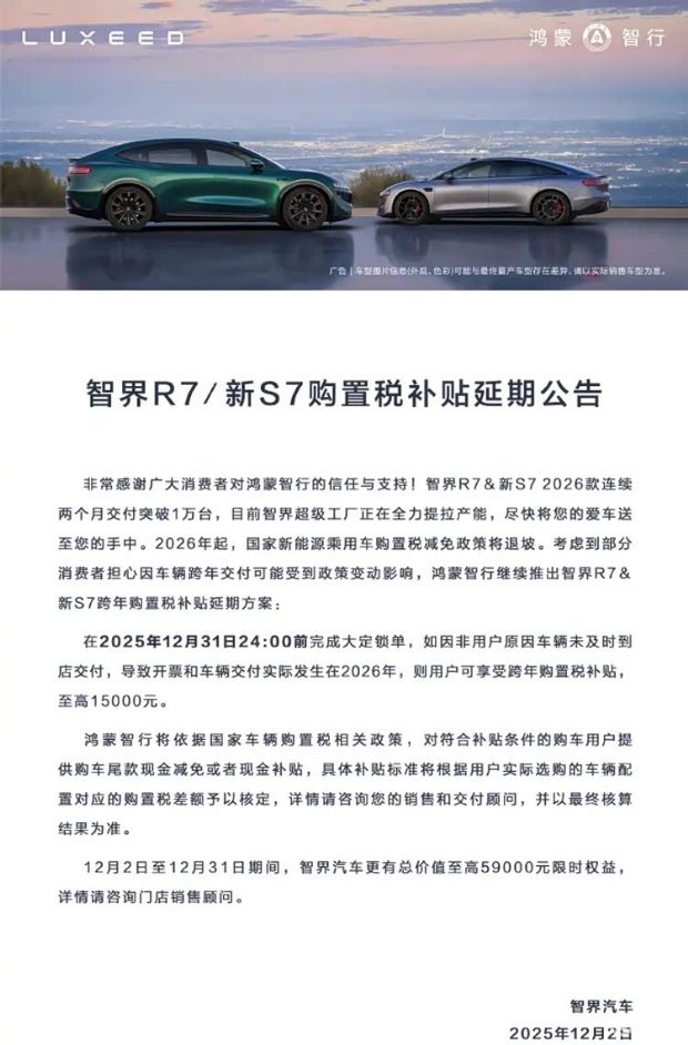 在2025年12月31日24:00前完成大定锁单,如因非用户原因车辆未及时到店交付,导致开票和车辆交付实际发生在2026年,则用户可享受跨年购置税补贴,至高15000元。12月2日至12月31日期间,智界汽车更有总价值至高59000元限时权益。