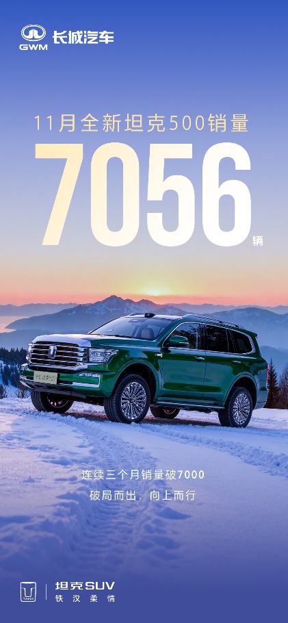 另一款主力车型全新坦克500则延续了稳健表现,11月销量达7056辆,已连续3个月销量破7000辆,持续引领30万元以上非承载越野SUV市场。作为一款全场景智能豪华越野SUV,全新坦克500在硬派越野底色之上,加持全场景NOA、智慧座舱,以及冰箱彩电大沙发,以越野+智能+豪华三合一优势,比传统豪华品牌更智能,比同类竞品越野更专业,比新势力适用的场景更多,满足了众多家庭用户“一车多用”的全场景需求。