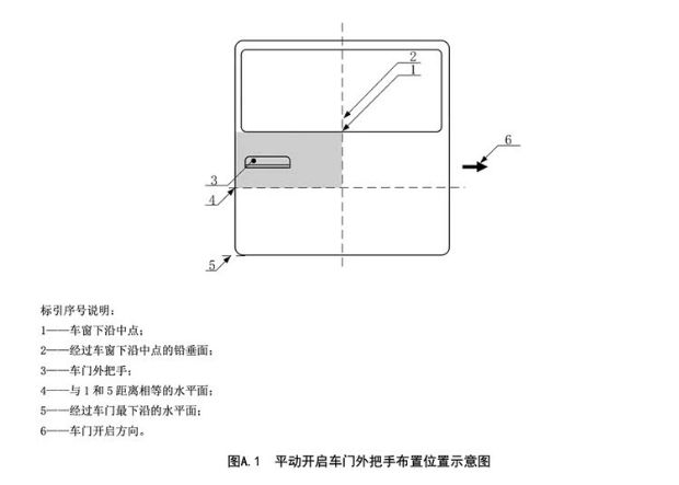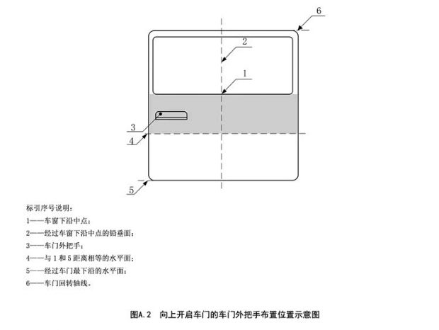 4.1.1.2 车门外把手应位于附录 A 规定的阴影区域内,或邻近阴影区域的车门或车门框架附近区域。平动开启车门的阴影区域如图 A.1 所示,向上旋转开启车门的阴影区域如图 A.2 所示,其他类型车门的阴影区域如图 A.3 所示。
