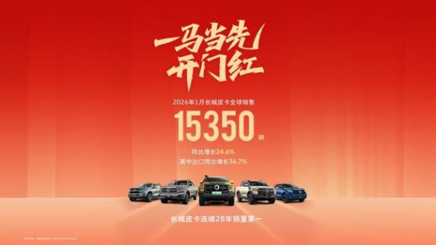 日前,长城皮卡公布1月销量数据。长城皮卡1月全球销售15350辆,同比增长24.6%。其中,长城皮卡海外销售5666辆,同比增长36.7%。