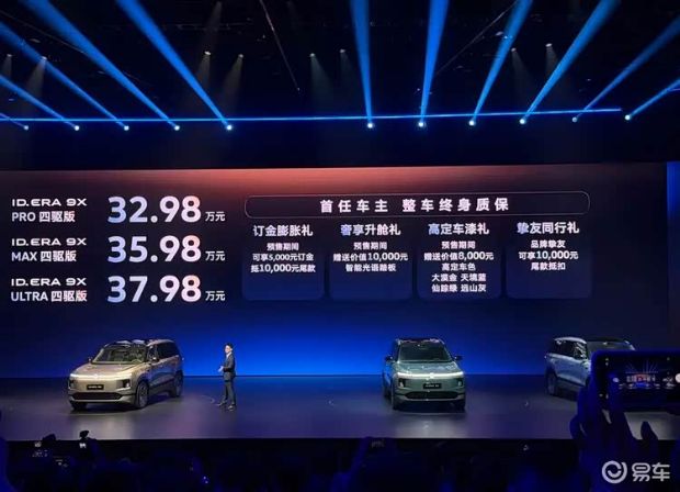 3月30日,上汽大众ID. ERA 9X正式开启预售,包含三款车型,预售价区间32.98-37.98万元,新车将于4月25日正式上市。ID. ERA 9X采用全新的设计语言,轴距达到3070mm。内饰方面配备了15.6英寸超高清中控主副驾双联屏以及21.4英寸后排娱乐屏,科技感十足。动力方面采用增程系统,CLTC纯电续航超400km。此外,ID. ERA 9X还首发9大黑科技技术。发布会现场官方还宣布,ID. ERA 9X与迪士尼公司旗下《星球大战》达成主题合作。