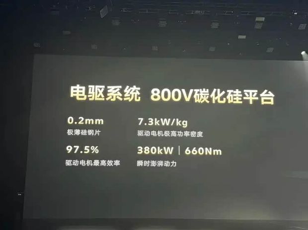 此外,新车搭载800V碳化硅平台,配备0.2mm极薄硅钢片,驱动电机极高功率密度7.3kW/kg,驱动电机最高效率97.5%,拥有380kW的功率和660N·m。目前,整车环境累计完成超1千万公里道路测试和验证,其中增程器台架耐久32000+小时,电池快充循环超2600圈,电驱耐久超20000小时,单个模块台架验证100万公里。