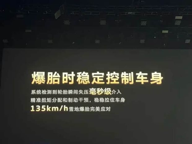 爆胎时可稳定控制车身,系统检测到轮胎瞬间失压可毫秒级介入,通过精准扭矩分配和制动干预,可稳稳拉住车身。据介绍,该系统可在135km/h的雪地场景下,完美应对。