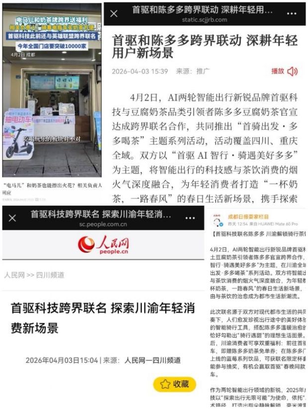近日,AI两轮智能出行新锐品牌首驱科技与豆腐奶茶品类引领者陈多多豆腐奶茶达成的跨界联名合作,凭借对年轻消费场景的深度挖掘与创新融合,一经官宣便引发人民网、四川经济网、封面新闻、成都日报等主流媒体高度关注,成为川渝地区消费市场与品牌营销领域的热议话题,“首骑出发·多多喝茶”系列活动更是迅速点燃年轻群体参与热情,为智能硬件与新茶饮的跨界联动贡献了标杆案例。