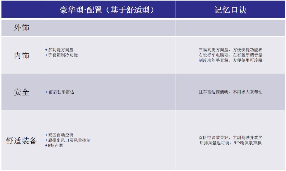 豪华型相比舒适型主要增加了多功能方向盘、前后倒车雷达、双区自动空调和后排出风口,在舒适性上进一步提升,不过知道豪华型才配备倒车雷达这似乎有点不符合常理。