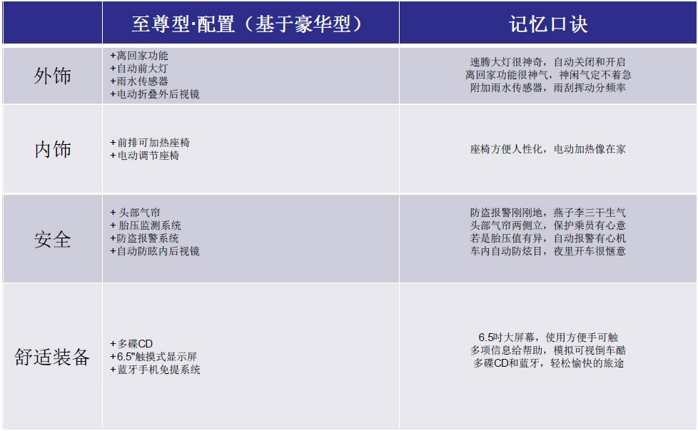 至尊型的配置非常丰富,几乎达到目前主流中级车水平。自动大灯、自动雨刷、自动防炫目后视镜和蓝牙系统让驾驶更加轻松。而RCD510系统的6.5吋大屏幕是较大的卖点。安全上还增加了安全气帘、胎压监测等装备。不过至尊版的售价预计不会低于18万元,并不会成为消费者选择的主流。